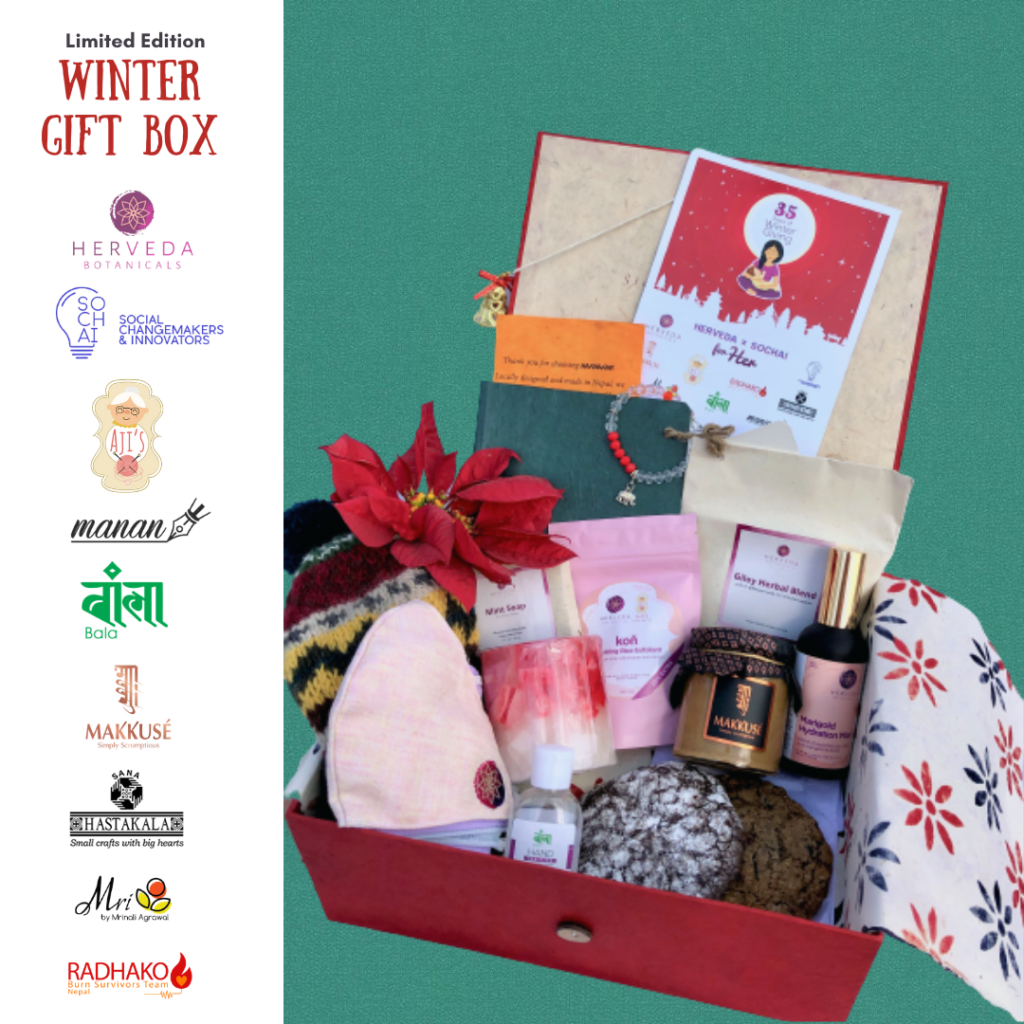 We also strongly believe that we cannot bring sustainable and huge impact alone, so we have partnered with 9 women led micro-enterprises on this Winter Giving Campaign to bring to you a specially curated Limited Edition Winter Gift Box featuring each of the brands’ products that are handcrafted in Nepal. We all share similar values of strengthening entrepreneurial ecosystems in Nepal and promoting local products through value addition.